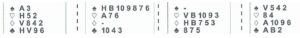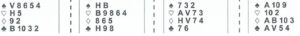 Het is verder van behoorlijk groot belang om goed inzicht in de kaartverdeling van de kaarten in de hand te hebben en het is van enorm groot belang om de honneurpunten correct te tellen. Om dat laatste nog eens te oefenen volgen een drietal opgaven waarbij de Noord, Oost, Zuid en West handen horizontaal zijn afgebeeld en de vraag is of jullie zo vriendelijk willen zijn de honneurpunten in iedere hand te tellen. (De som van de vier horizontale handen moet uiteraard 40 zijn zodat jullie zelf kunnen controleren of de opgaven correct zijn gemaakt).